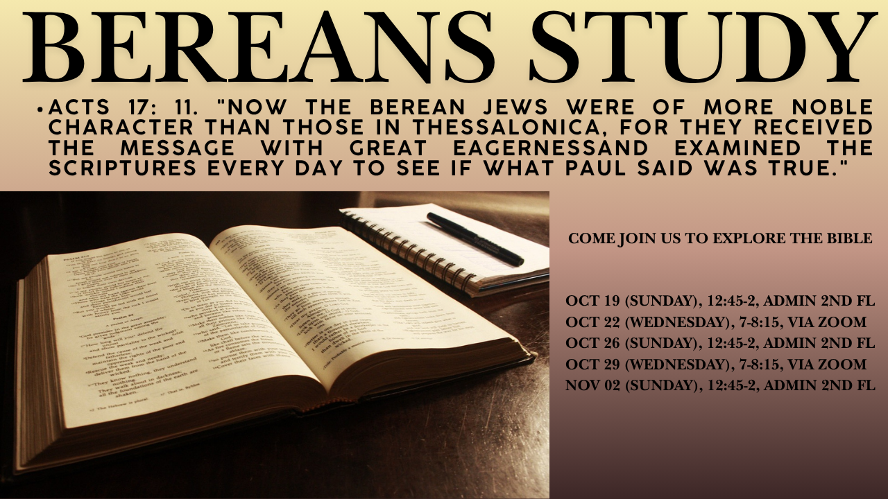 BEREANS STUDY Sunday, October 19, 2025 12:45 PM 2:00 PM The Well Fellowship 702 Kincaid Avenue Sumner, WA, 98390 United States (map) Google Calendar ICS